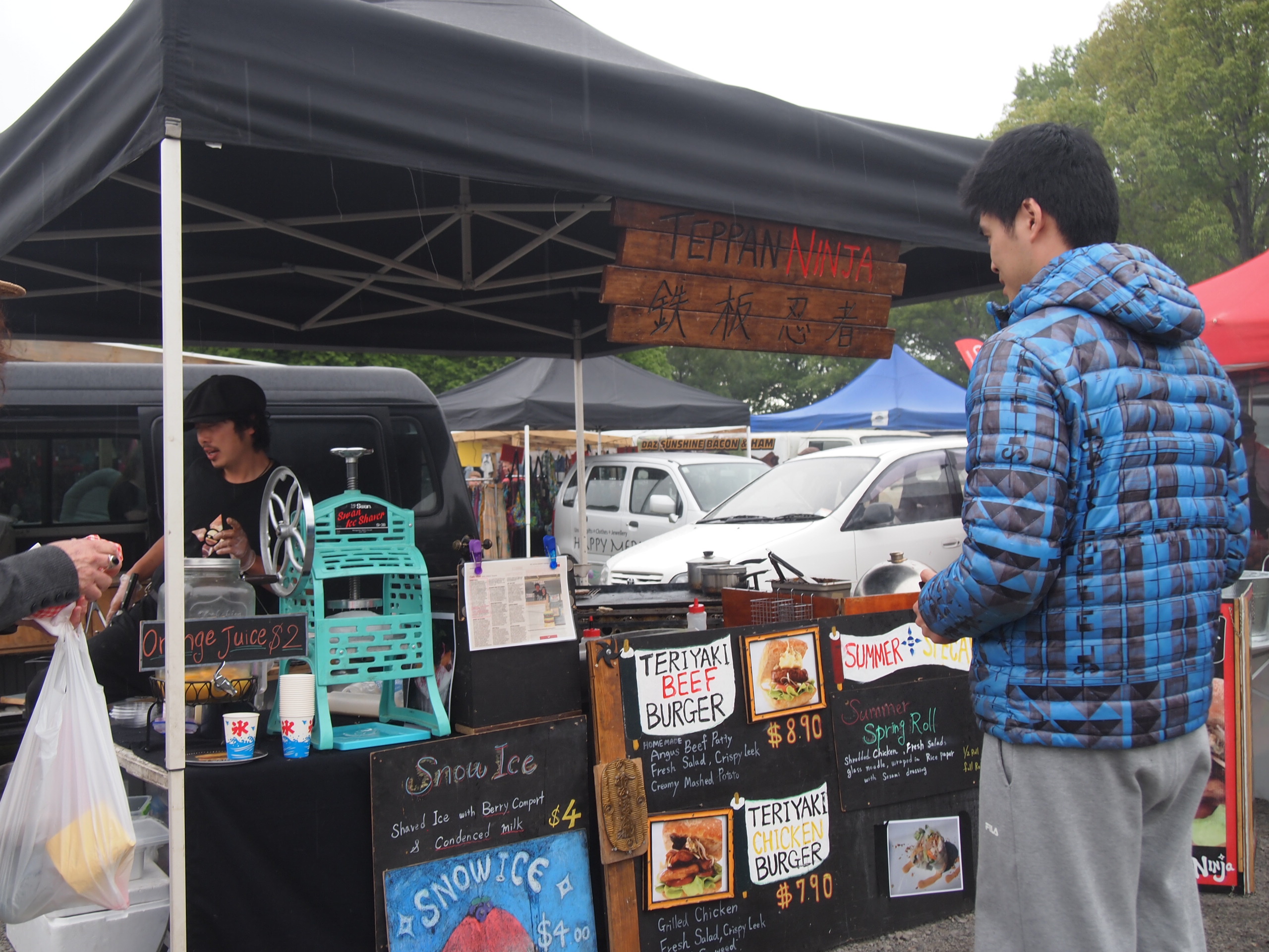 忍者バーガーさんのテリヤキチキンバーガーwith卵。通常7.9NZD、卵入りで8.9NZD。忙しくて大変そうだった。