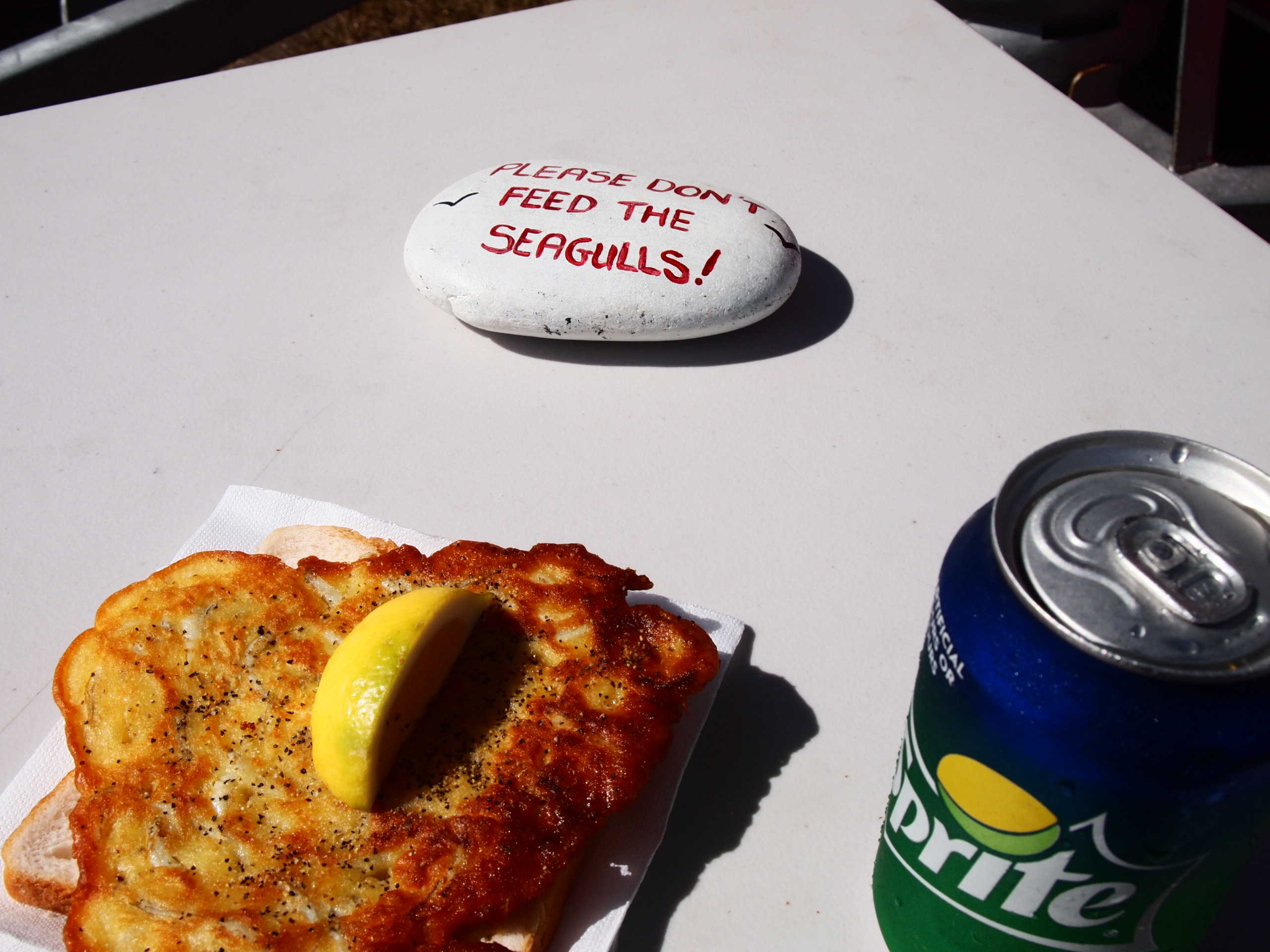 日本にも旅行しに来た事のあるという、屋台のおじちゃんにWhitebait(しらす)のパティをパンに乗せたものを作ってもらいました。